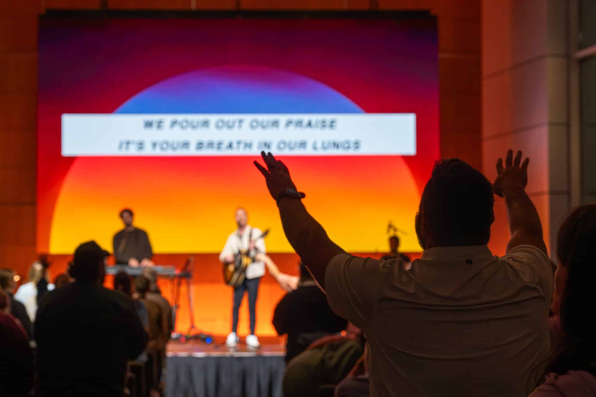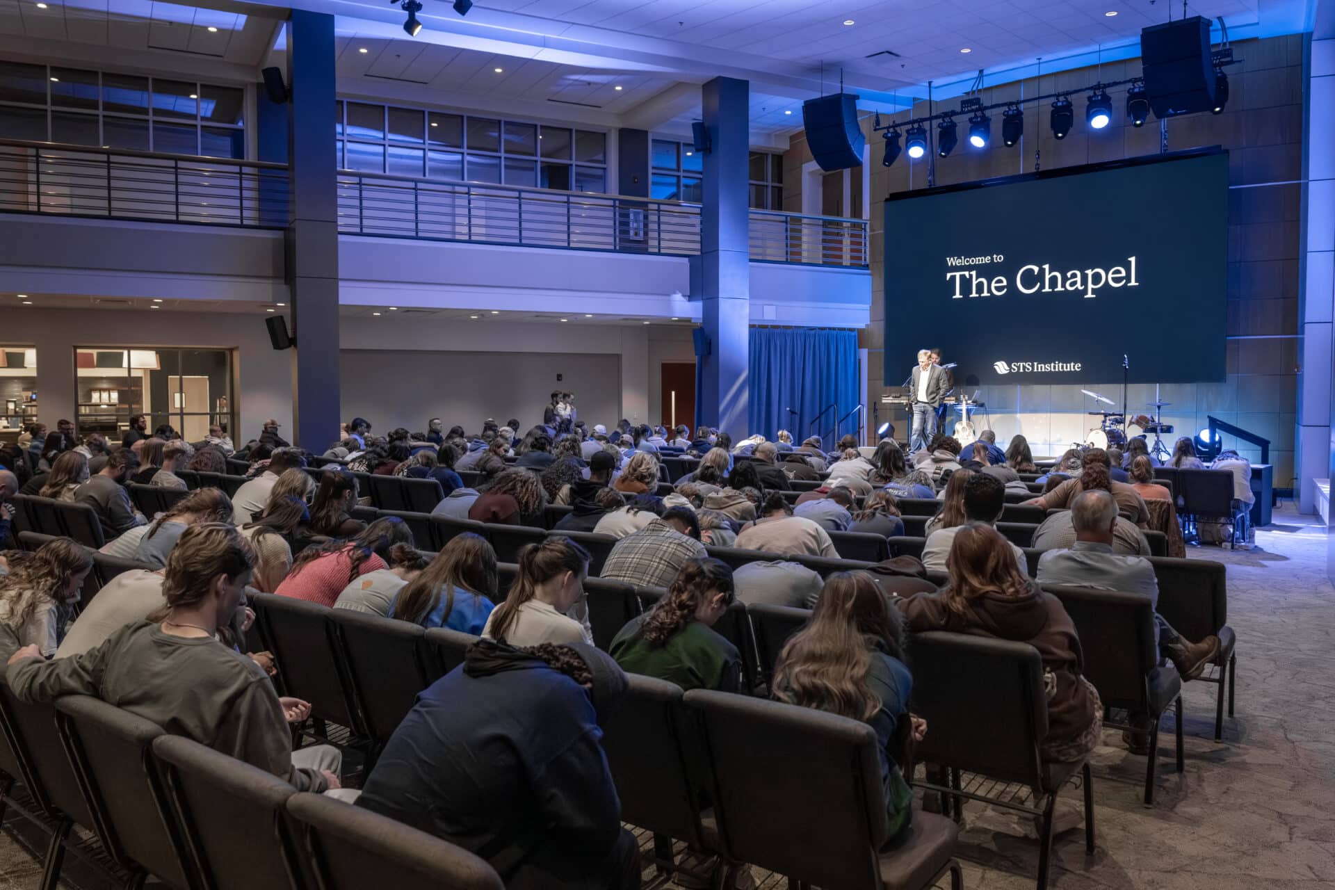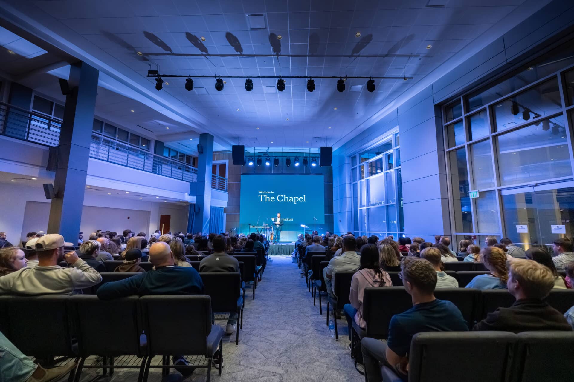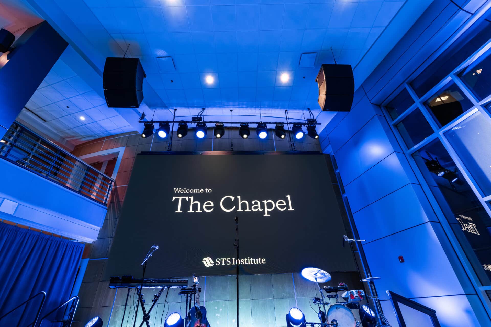 The renovation included a complete audio system upgrade, a new LED wall to support teaching and worship, intentional stage and house lighting, and acoustic treatments designed to create clarity and focus throughout the room. Together, these systems work to remove distractions and allow the message to be heard and experienced clearly.